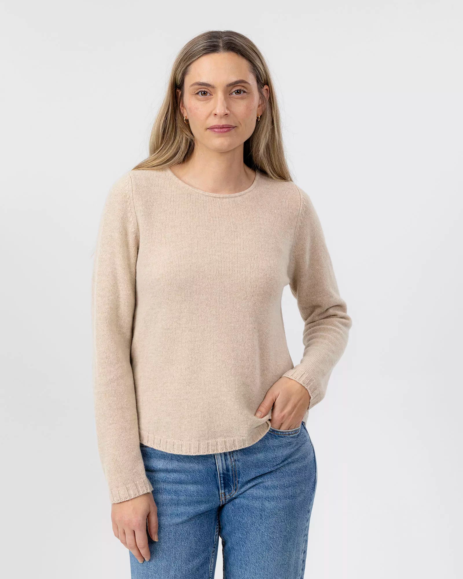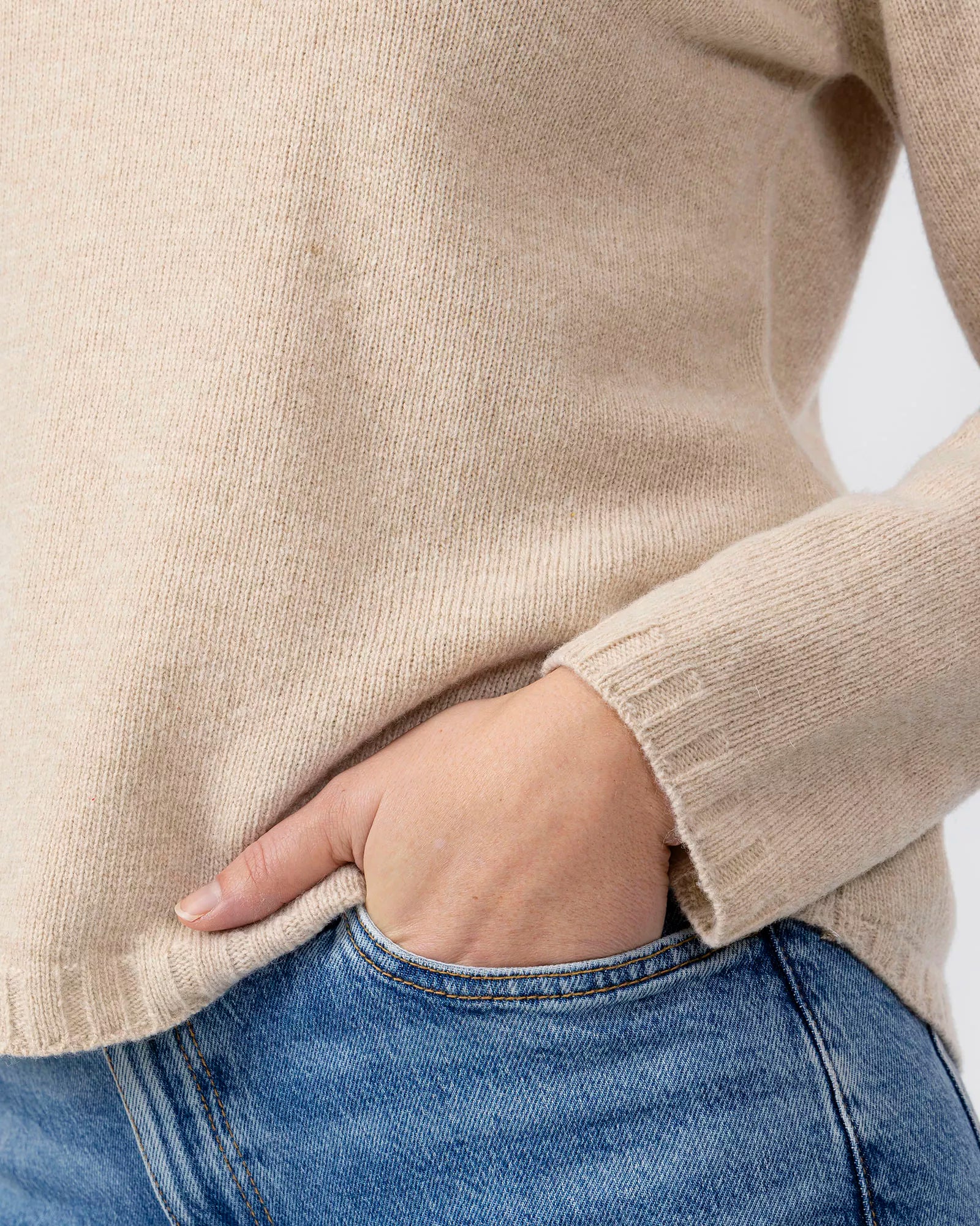 This wool blend sweater features a soft texture, classic crew neck, and rounded bottom for a comfortable and stylish fit. The ribbed details on the bottom and sleeve endings add an extra touch of detail. Made in Europe with 80% wool and 20% PA, this sweater exudes quality and craftsmanship. Article Number: A32403.
