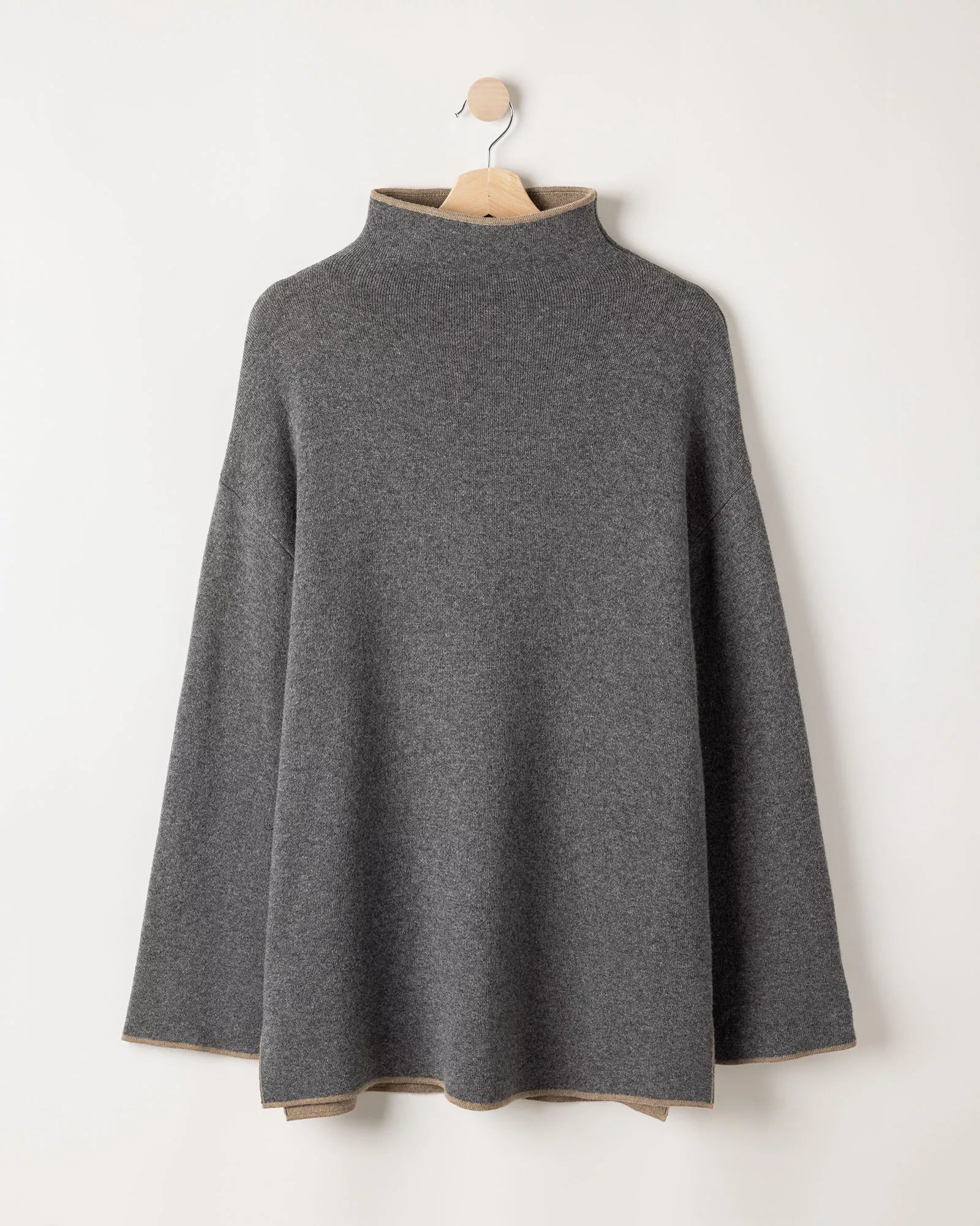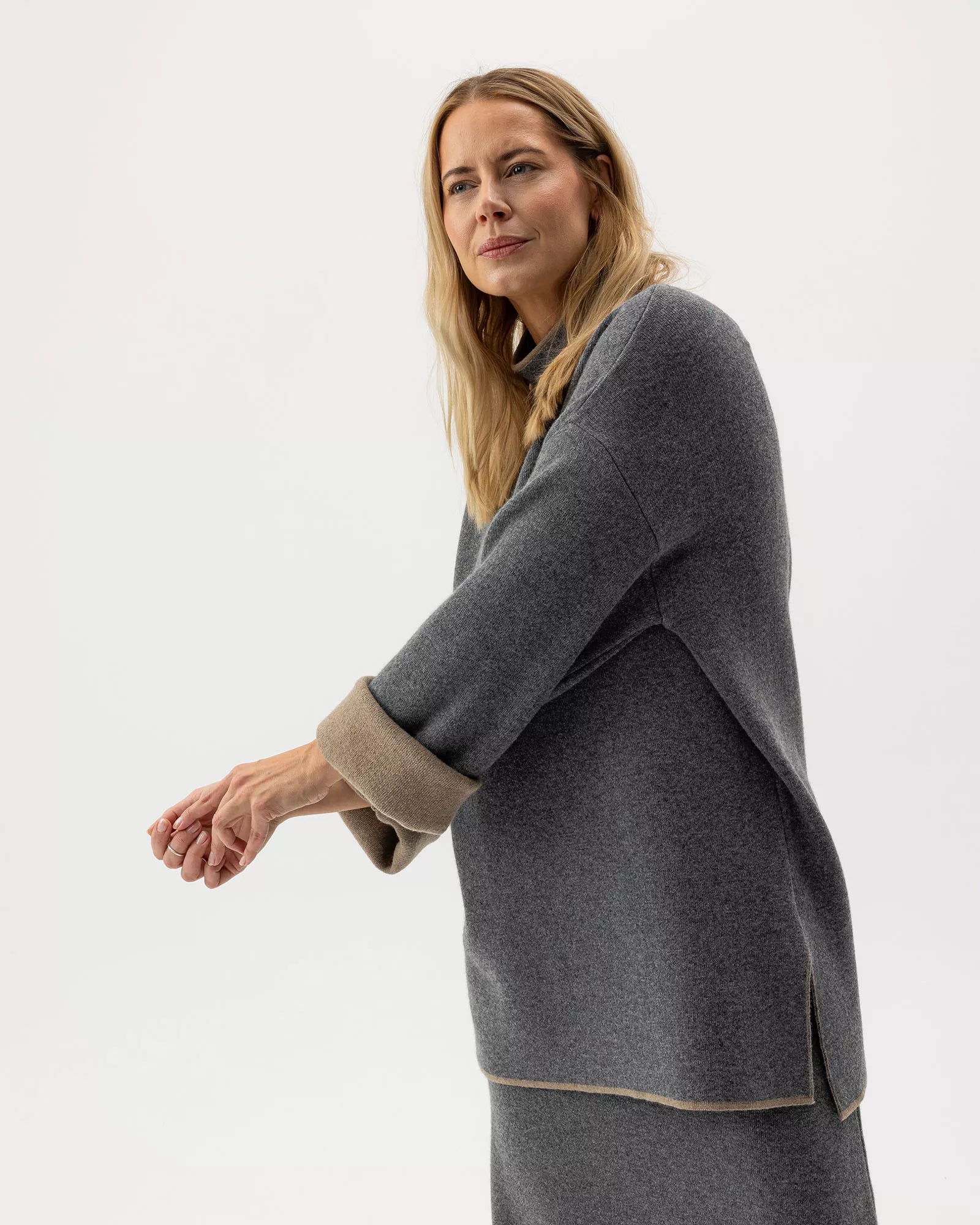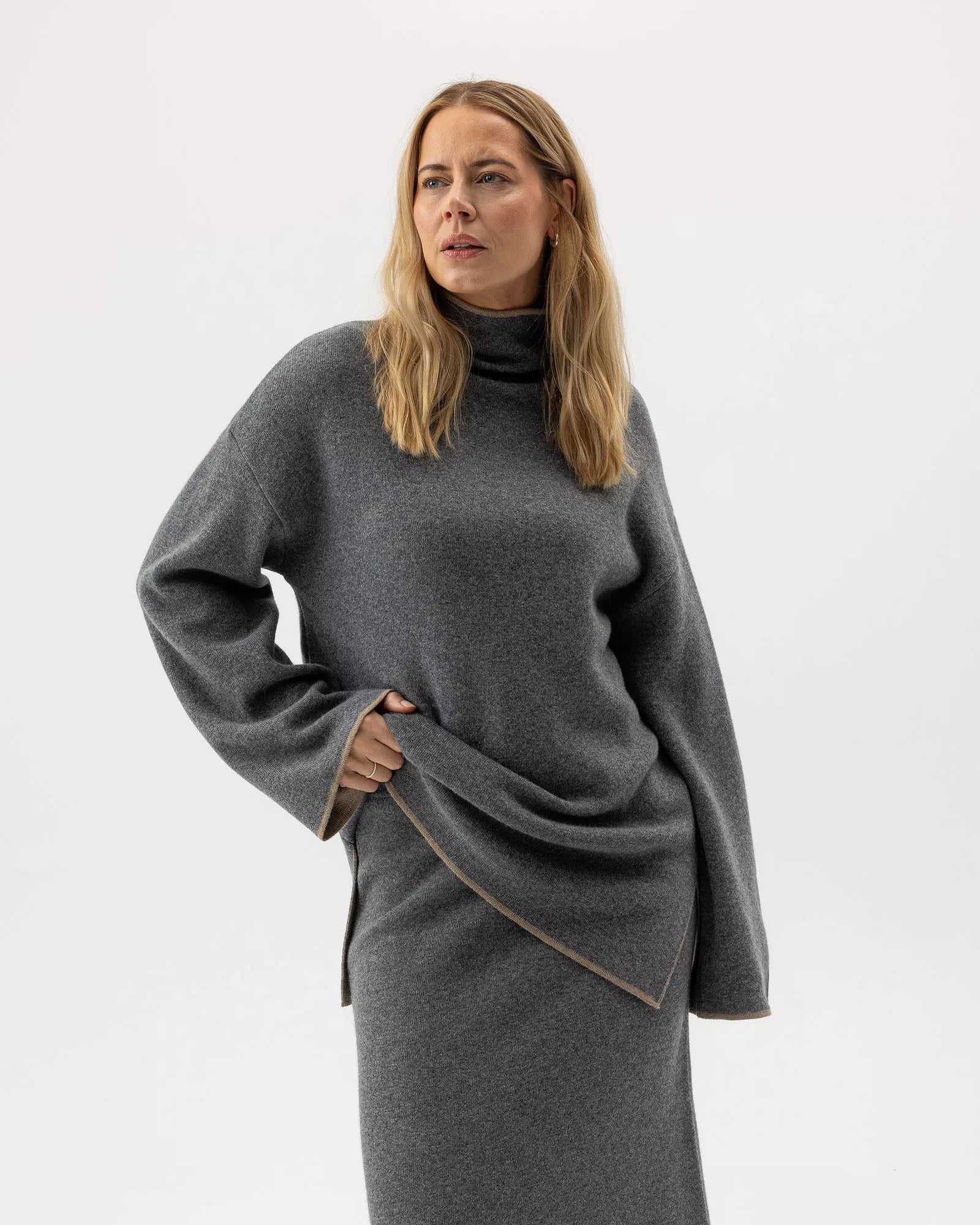 Knitted sweater in a soft cashmere blend. Turtleneck, dropped shoulders and slightly longer model. Contrasting colour at the hemline and on the inside of the sweater, and visible at the slits in the sides. Combine with Sally Skirt for a comfortable and matching set. The sweater is large in size, go down one size for a regular fit.The yarn is certified according to GRS, which is a guarantee that the yarn contains a higher minimum amount of recycled material, traceability and additional social and environmental requirements. Sustainably produced in Europe.