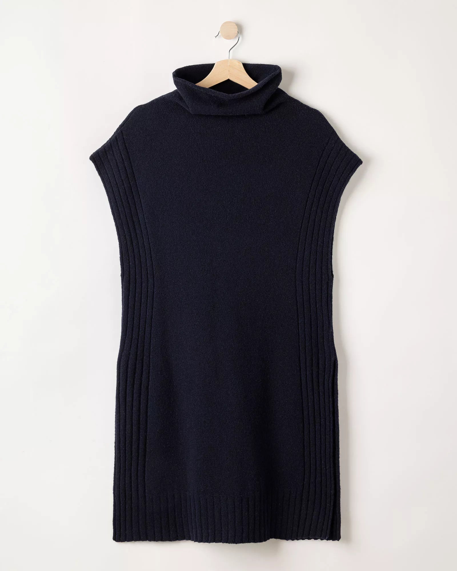 Flat knit longer vest in a soft wool blend. High collar with a loose fit, dropped shoulders and ribbed details along the sides. Knee length and high slits at the sides. Combine with Sonja Pants for a matching set, or as it is over a sweater or shirt. Sustainably produced in Europe.
