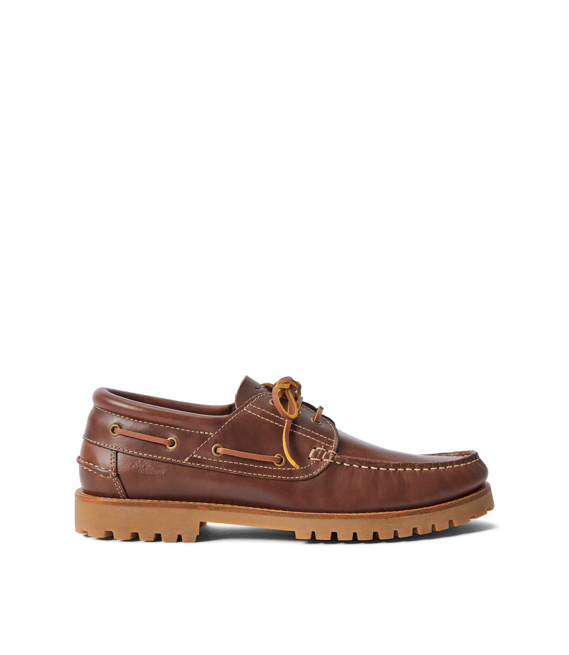 A rugged and adventure-ready shoe for year-round dressing. This style is crafted from pull up leather in a moccasin construction, with leather lacing and a treaded rubber sole.