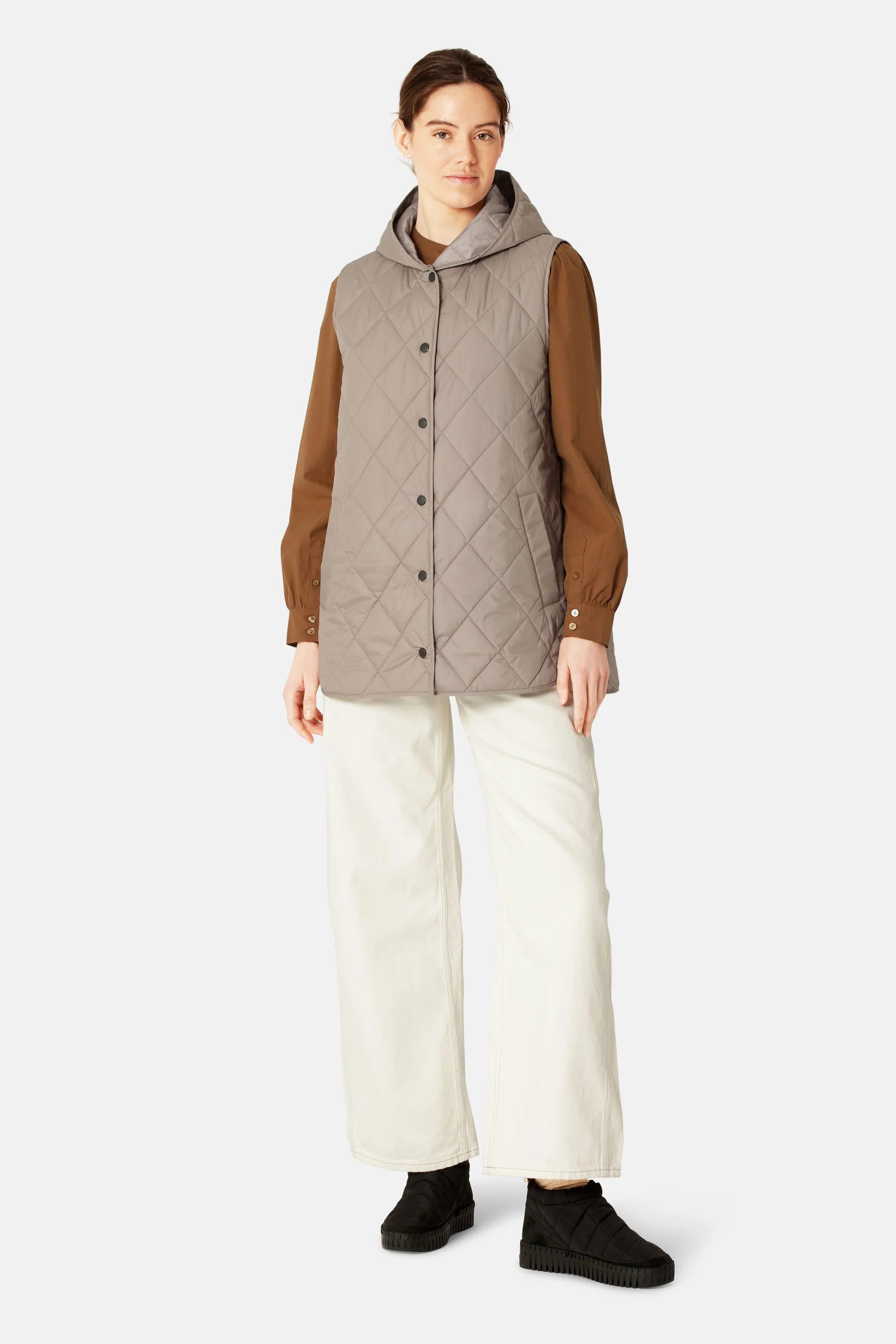 A long, slightly A-line padded vest featuring a diagonal quilted pattern and a hood for added warmth. Slanted jetted pockets provide both style and comfort, while logo buttons at the front add a branded detail. A curved hemline with side slits enhances ease of movement.