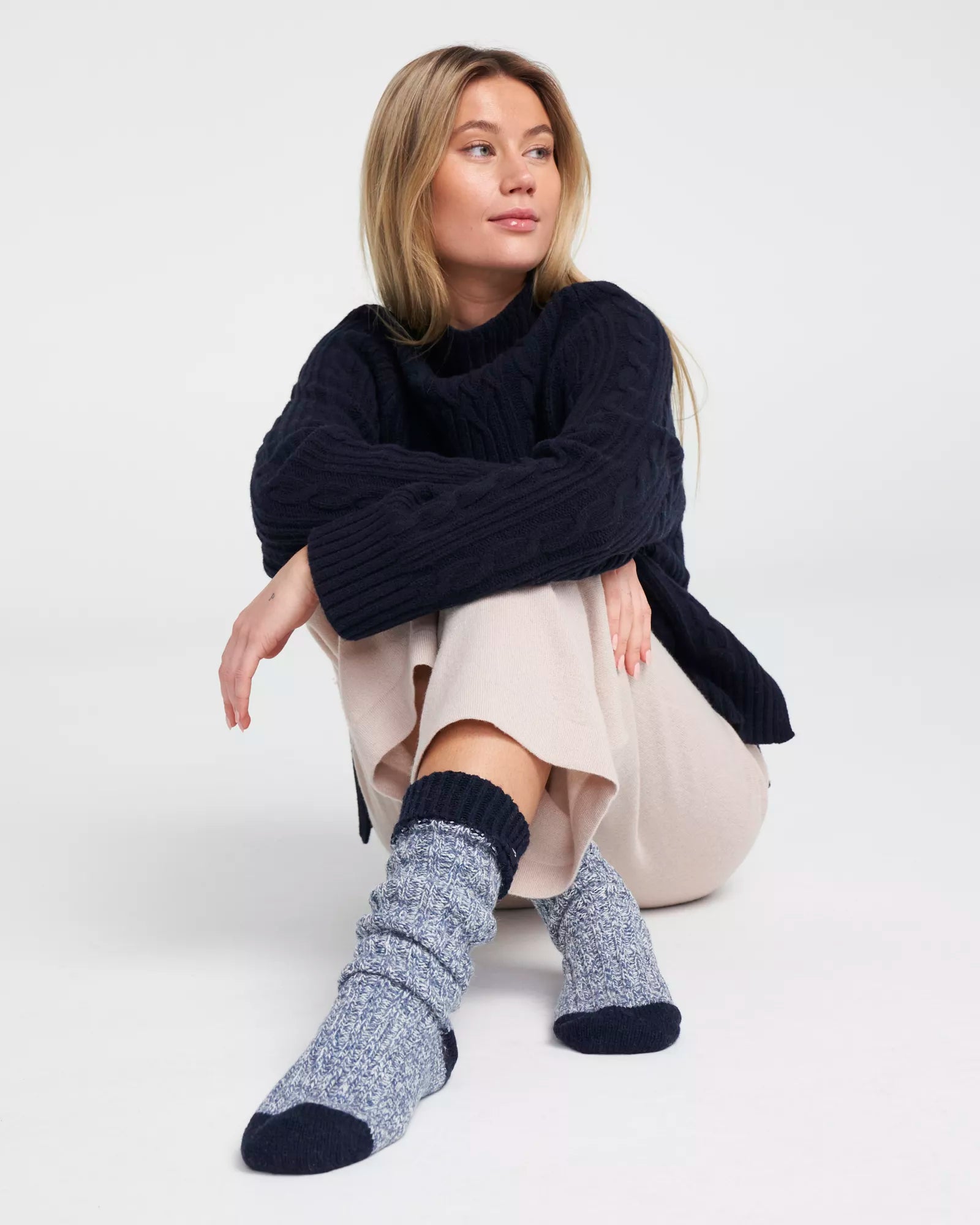 Jacquard-knitted wool blend sock. Ribbed top and classic pattern. The yarn is certified according to GRS, which is a guarantee that the yarn contains a higher minimum amount of recycled material, traceability and additional social and environmental requirements. Produced in Europe.