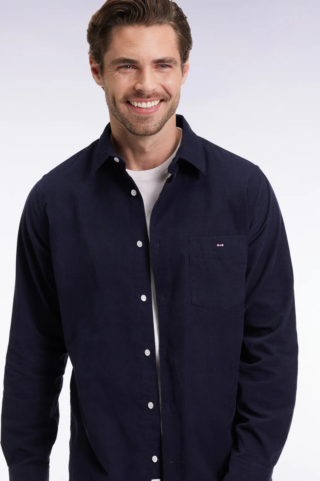 Soft texture and relaxed spirit for this men's shirt in cotton velvet, available in a wide range of colors: beige, navy, sky, khaki or black. Designed to be worn on its own or as an overshirt over a plain T-shirt, it has a comfortable straight cut. The free-point collar, patch pocket embroidered with our signature bow tie and meticulous finishing ensure all-day comfort and elegance for this essential piece in the Eden Park wardrobe, a blend of sport-chic heritage and contemporary allure.