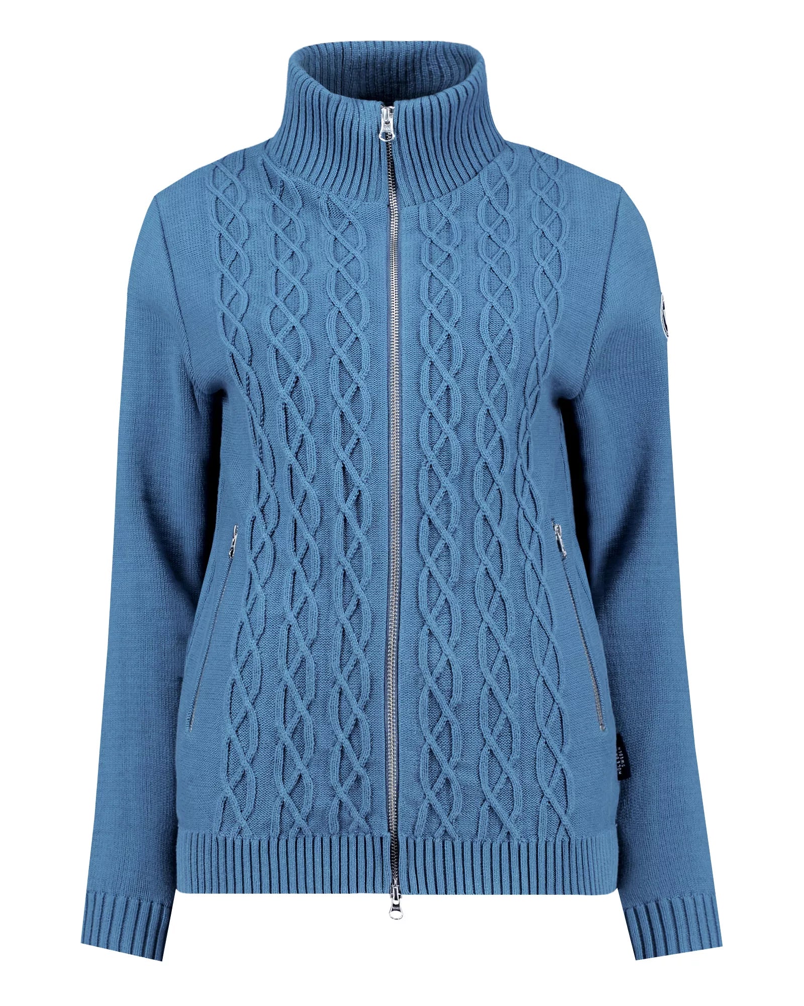 Crafted from 100% organic cotton, the Holebrook Marianne Fullzip Wp In Copen Blue sweater features a high collar and double zipper, as well as ribbed details at the collar, sleeve endings, and bottom. The front also includes a windproof structure knit design and metal zipper closure, with additional side pockets for convenience. Made in Europe with a regular fit and article number H42402, this sweater is pure comfort and quality.