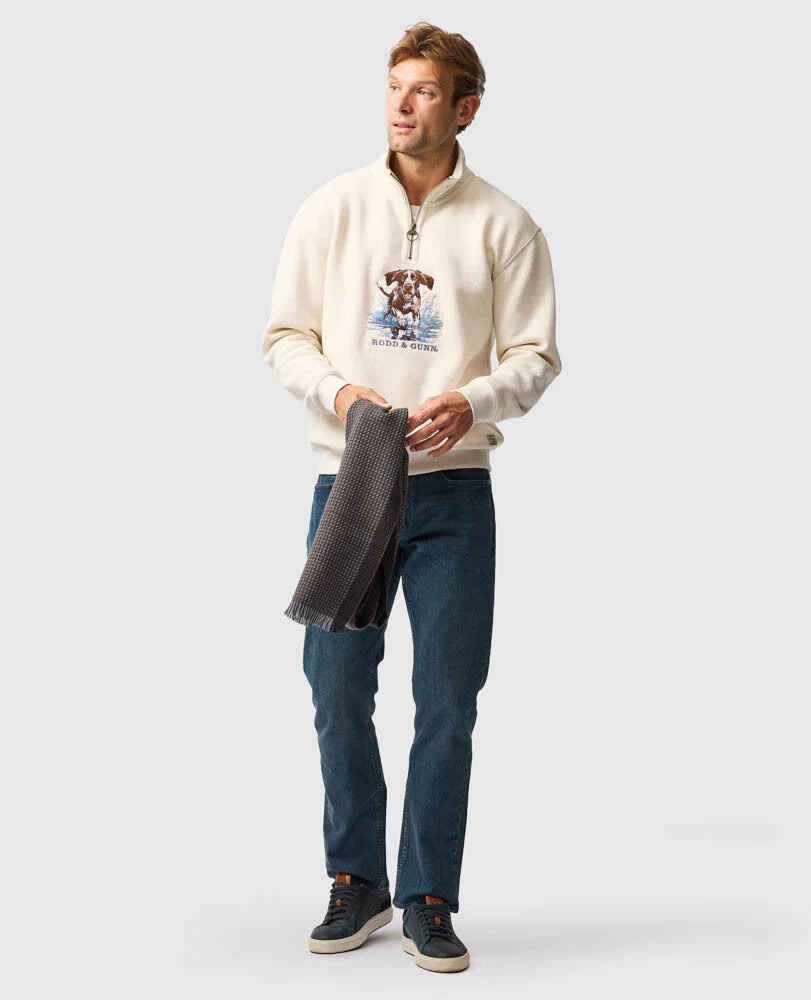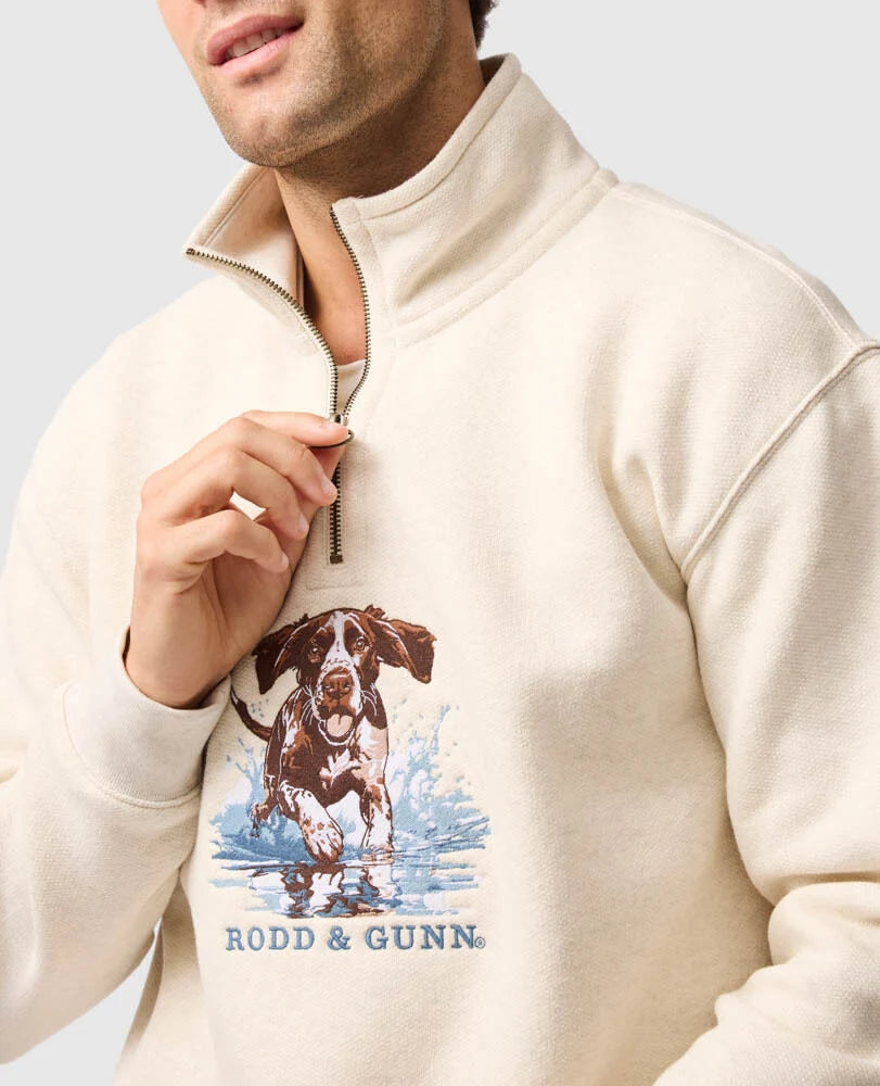 The Gunner's Track quarter zip features an embroidered artwork that pays homage to Rodd & Gunn's beloved English pointer and brand ambassador, Gunner. Crafted from brushed- back fleece this sweat is designed for versatility and comfort. Wear it zipped up for a sleek look or unzipped for a more casual vibe.